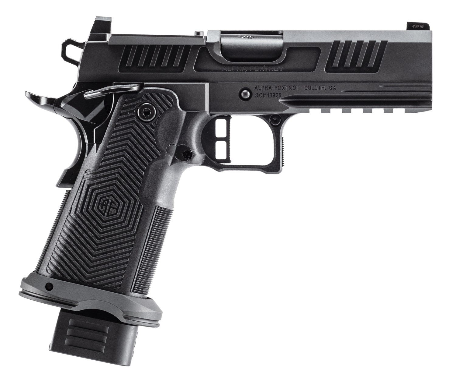 The AF1911 Romulus delivers full-size performance with Alpha Foxtrot’s modern 2011-style engineering. Featuring a black polished DLC finish on the frame and slide; Bull barrel; Night Fision sight; Picatinny rail; ambidextrous thumb safety; flared magwell and is RMSC/RMR optics cut. Includes MOS adapter plate, RMSC and RMR plate, 17rd and 20rd magaine.