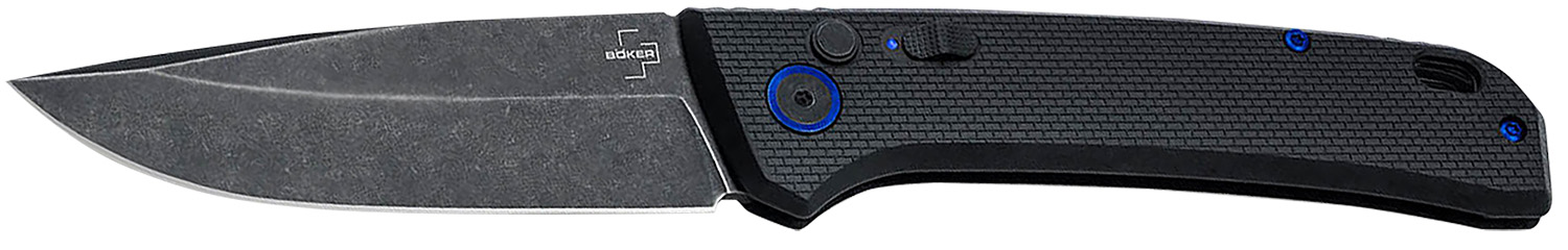 The Boker Plus FRND Black breaks free of the daily humdrum and invigorates as a varied and slim automatic knife with EDC character. The drop-point blade made of D2 opens by push button and has a smoky black stonewash finish that makes small traces of use almost disappear even after hard use. The robust button lock with an additional slider doubly secures the blade during use and significantly minimises the risk of unruly cutting action escapes. Accidental opening in a trouser pocket is also a thing of the past thanks to the safety catch. The textured Grivory handle scales provide a firm grip even in wet conditions and highlights the lightness of the pocket-knife. Decorative accents are set by the anodised screws and the blue-edged blade axle screw.