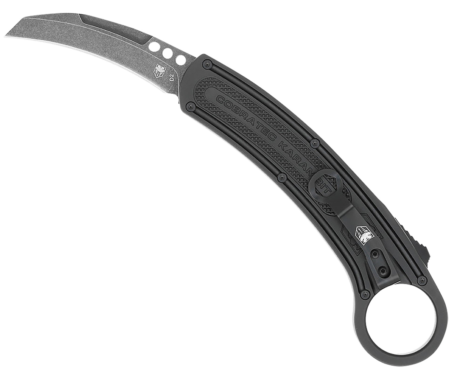 The CobraTec Karambit is a fully automatic double action OTF designed with carry and deployment in mind. All CNC construction makes for a precision fit and finish inside and out. The thumb activation switch conveniently located by the retention ring makes for ease in deploying the D2 steel stonewashed blade during the reverse grip draw. The CobraTec Karambit is very durable,